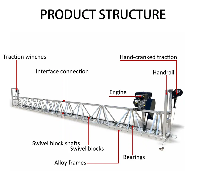 Die 18 -m -Betonboden -Aluminium -Vibrationsbinder -Estrichmaschine ist eine Rahmennivellierungsmaschine mit gleichmäßiger Geschwindigkeit, stabiler Leistung und einstellbarer Länge.
