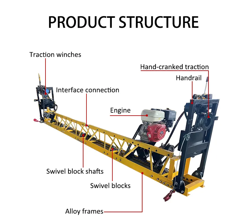 Die 8m hydroomatische automatische Vibrationsbinder-Estrichmaschine ist mit einer handgesiedelten Winde ausgestattet, die bequem zu kontrollieren ist und den Arbeitsprozess beschleunigt. Die manuelle Winde nimmt Legierungsstahlgeräte an, die arbeitssparend, langlebig, bequem und einfach zu bedienen sind.
